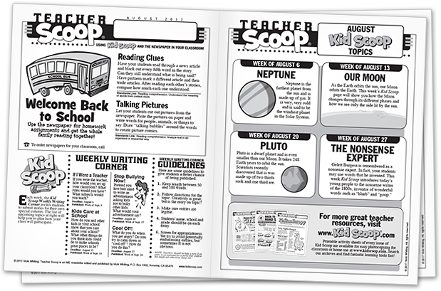 Teacher Scoop is a monthly newsletter that presents interesting ways for teachers to reach their students and involve them in their community through the use of the newspaper. Teacher Scoop provides lesson ideas, complimentary subject material, previews of upcoming Kid Scoop topics and Weekly Writing Corner topics.